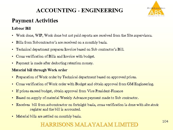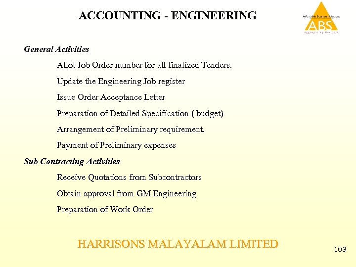 ACCOUNTING - ENGINEERING General Activities Allot Job Order number for all finalized Tenders. Update the Engineering Job register Issue Order Acceptance Letter Preparation of Detailed Specification ( budget) Arrangement of Preliminary requirement. Payment of Preliminary expenses Sub Contracting Activities Receive Quotations from Subcontractors Obtain approval from GM Engineering Preparation of Work Order HARRISONS MALAYALAM LIMITED 103