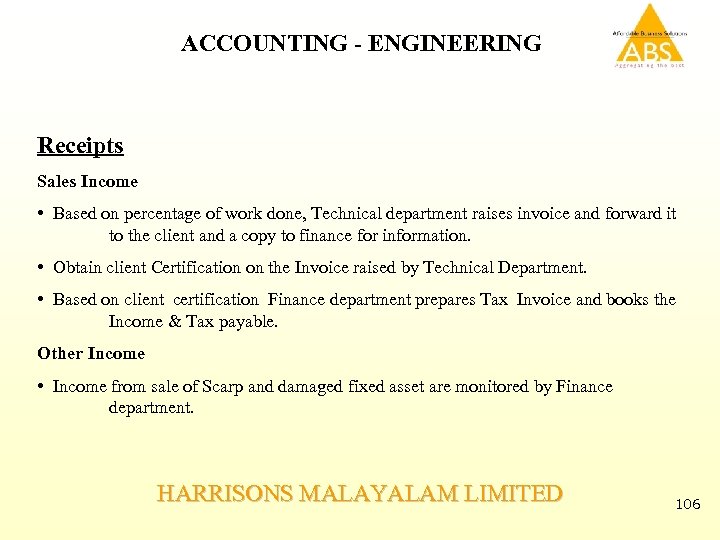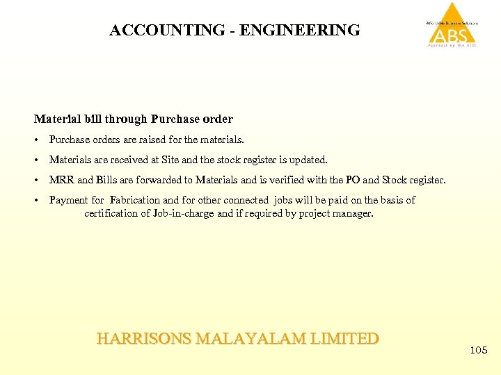ACCOUNTING - ENGINEERING Material bill through Purchase order • Purchase orders are raised for the materials. • Materials are received at Site and the stock register is updated. • MRR and Bills are forwarded to Materials and is verified with the PO and Stock register. • Payment for Fabrication and for other connected jobs will be paid on the basis of certification of Job-in-charge and if required by project manager. HARRISONS MALAYALAM LIMITED 105