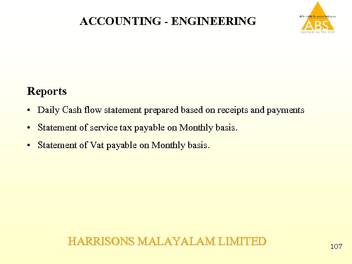 ACCOUNTING - ENGINEERING Reports • Daily Cash flow statement prepared based on receipts and payments • Statement of service tax payable on Monthly basis. • Statement of Vat payable on Monthly basis. HARRISONS MALAYALAM LIMITED 107