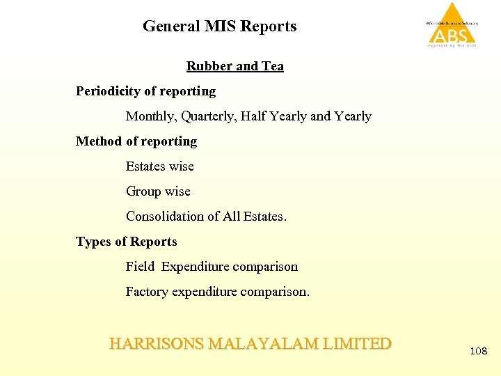 General MIS Reports Rubber and Tea Periodicity of reporting Monthly, Quarterly, Half Yearly and Yearly Method of reporting Estates wise Group wise Consolidation of All Estates. Types of Reports Field Expenditure comparison Factory expenditure comparison. HARRISONS MALAYALAM LIMITED 108
