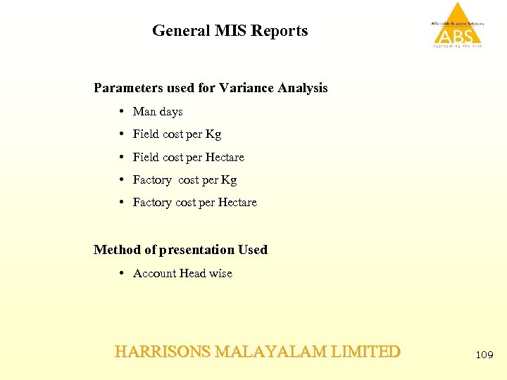 General MIS Reports Parameters used for Variance Analysis • Man days • Field cost per Kg • Field cost per Hectare • Factory cost per Kg • Factory cost per Hectare Method of presentation Used • Account Head wise HARRISONS MALAYALAM LIMITED 109