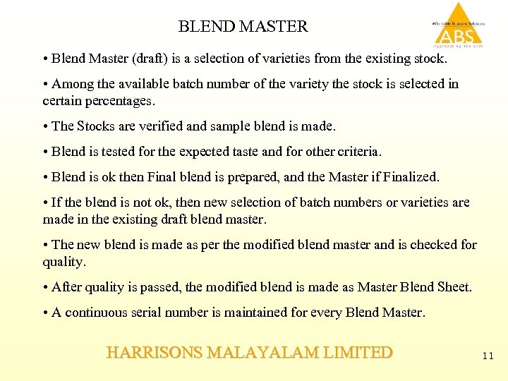 BLEND MASTER • Blend Master (draft) is a selection of varieties from the existing stock. • Among the available batch number of the variety the stock is selected in certain percentages. • The Stocks are verified and sample blend is made. • Blend is tested for the expected taste and for other criteria. • Blend is ok then Final blend is prepared, and the Master if Finalized. • If the blend is not ok, then new selection of batch numbers or varieties are made in the existing draft blend master. • The new blend is made as per the modified blend master and is checked for quality. • After quality is passed, the modified blend is made as Master Blend Sheet. • A continuous serial number is maintained for every Blend Master. HARRISONS MALAYALAM LIMITED 11