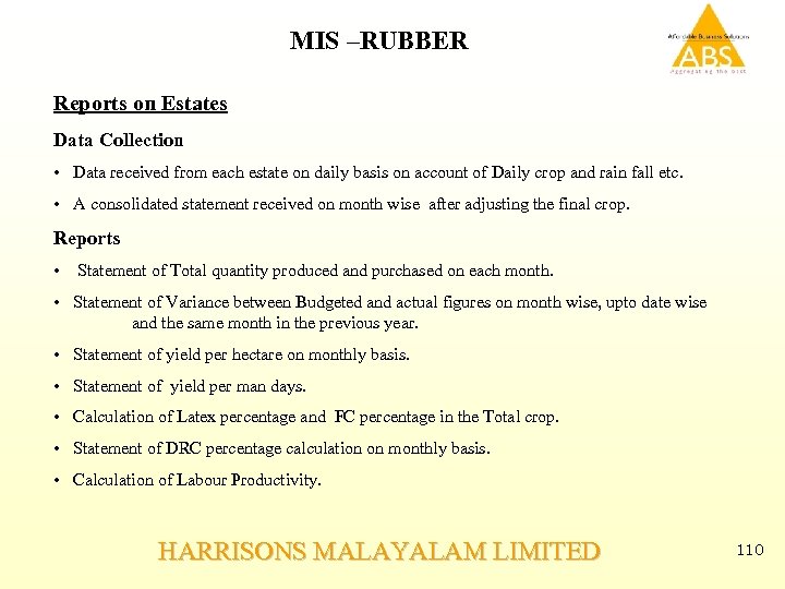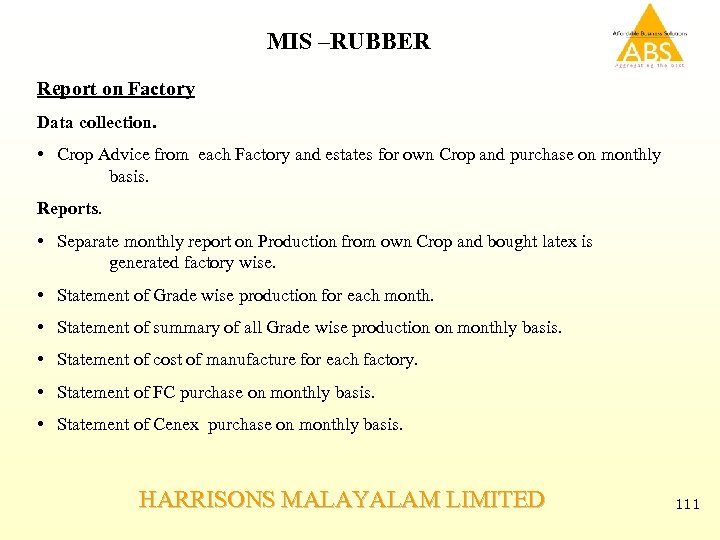 MIS –RUBBER Report on Factory Data collection. • Crop Advice from each Factory and estates for own Crop and purchase on monthly basis. Reports. • Separate monthly report on Production from own Crop and bought latex is generated factory wise. • Statement of Grade wise production for each month. • Statement of summary of all Grade wise production on monthly basis. • Statement of cost of manufacture for each factory. • Statement of FC purchase on monthly basis. • Statement of Cenex purchase on monthly basis. HARRISONS MALAYALAM LIMITED 111