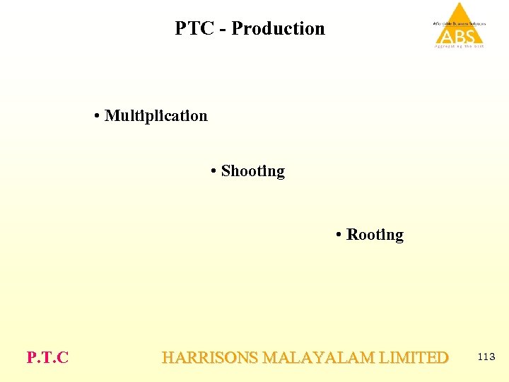 PTC - Production • Multiplication • Shooting • Rooting P. T. C HARRISONS MALAYALAM LIMITED 113