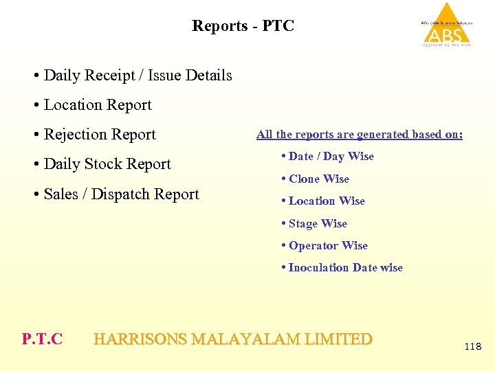 Reports - PTC • Daily Receipt / Issue Details • Location Report • Rejection Report • Daily Stock Report • Sales / Dispatch Report All the reports are generated based on: • Date / Day Wise • Clone Wise • Location Wise • Stage Wise • Operator Wise • Inoculation Date wise P. T. C HARRISONS MALAYALAM LIMITED 118