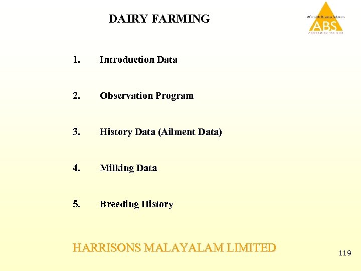 DAIRY FARMING 1. Introduction Data 2. Observation Program 3. History Data (Ailment Data) 4. Milking Data 5. Breeding History HARRISONS MALAYALAM LIMITED 119