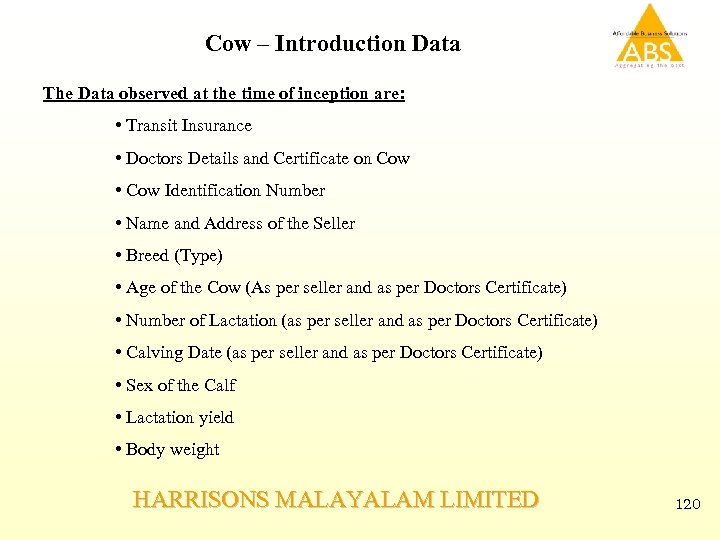 Cow – Introduction Data The Data observed at the time of inception are: • Transit Insurance • Doctors Details and Certificate on Cow • Cow Identification Number • Name and Address of the Seller • Breed (Type) • Age of the Cow (As per seller and as per Doctors Certificate) • Number of Lactation (as per seller and as per Doctors Certificate) • Calving Date (as per seller and as per Doctors Certificate) • Sex of the Calf • Lactation yield • Body weight HARRISONS MALAYALAM LIMITED 120