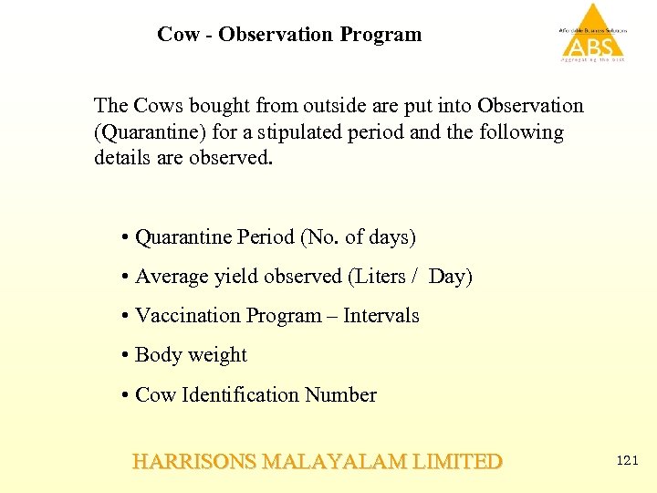 Cow - Observation Program The Cows bought from outside are put into Observation (Quarantine) for a stipulated period and the following details are observed. • Quarantine Period (No. of days) • Average yield observed (Liters / Day) • Vaccination Program – Intervals • Body weight • Cow Identification Number HARRISONS MALAYALAM LIMITED 121