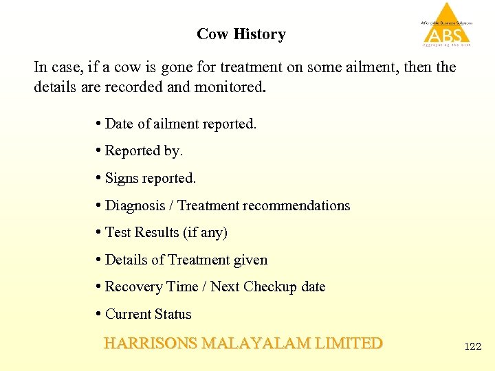 Cow History In case, if a cow is gone for treatment on some ailment, then the details are recorded and monitored. • Date of ailment reported. • Reported by. • Signs reported. • Diagnosis / Treatment recommendations • Test Results (if any) • Details of Treatment given • Recovery Time / Next Checkup date • Current Status HARRISONS MALAYALAM LIMITED 122