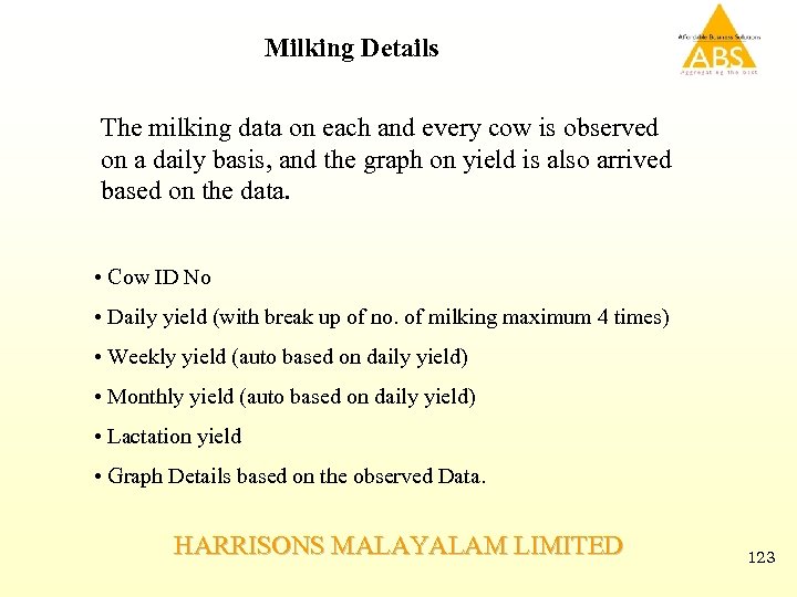 Milking Details The milking data on each and every cow is observed on a daily basis, and the graph on yield is also arrived based on the data. • Cow ID No • Daily yield (with break up of no. of milking maximum 4 times) • Weekly yield (auto based on daily yield) • Monthly yield (auto based on daily yield) • Lactation yield • Graph Details based on the observed Data. HARRISONS MALAYALAM LIMITED 123
