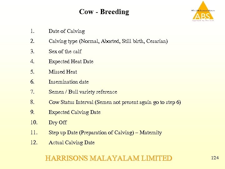 Cow - Breeding 1. Date of Calving 2. Calving type (Normal, Aborted, Still birth, Cesarian) 3. Sex of the calf 4. Expected Heat Date 5. Missed Heat 6. Insemination date 7. Semen / Bull variety reference 8. Cow Status Interval (Semen not present again go to step 6) 9. Expected Calving Date 10. Dry Off 11. Step up Date (Preparation of Calving) – Maternity 12. Actual Calving Date HARRISONS MALAYALAM LIMITED 124