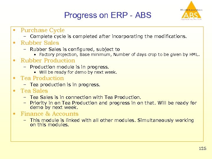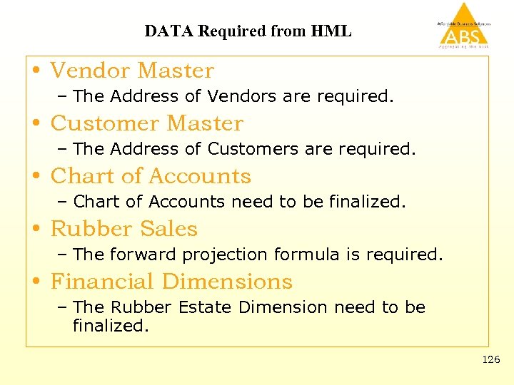 Progress on ERP - ABS • Purchase Cycle – Complete cycle is completed after incorporating the modifications. • Rubber Sales – Rubber Sales is configured, subject to • Factory projection, Base minimum, Number of days crop to be given by HML. • Rubber Production – Production module is in progress. • Will be ready for demo by next week. • Tea Production – Tea production is in progress. • Tea Sales – Tea Sales is in connection with Tea Production. – Priority in on Tea Production and progress in on that. Will be ready for demo by next week. • Finance & Accounts – This module is linked with all other modules. Simultaneously working on this modules. 125