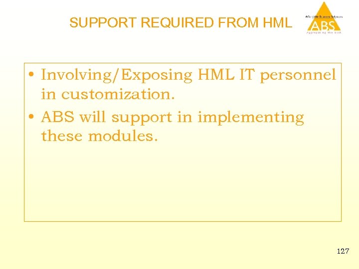 SUPPORT REQUIRED FROM HML • Involving/Exposing HML IT personnel in customization. • ABS will support in implementing these modules. 127