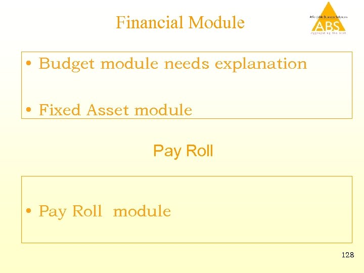 Financial Module • Budget module needs explanation • Fixed Asset module Pay Roll • Pay Roll module 128