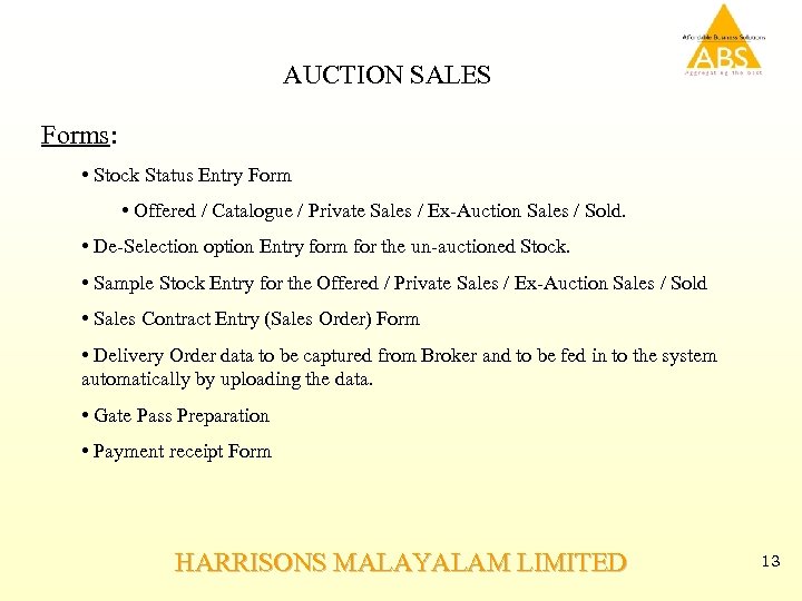 AUCTION SALES Forms: • Stock Status Entry Form • Offered / Catalogue / Private Sales / Ex-Auction Sales / Sold. • De-Selection option Entry form for the un-auctioned Stock. • Sample Stock Entry for the Offered / Private Sales / Ex-Auction Sales / Sold • Sales Contract Entry (Sales Order) Form • Delivery Order data to be captured from Broker and to be fed in to the system automatically by uploading the data. • Gate Pass Preparation • Payment receipt Form HARRISONS MALAYALAM LIMITED 13