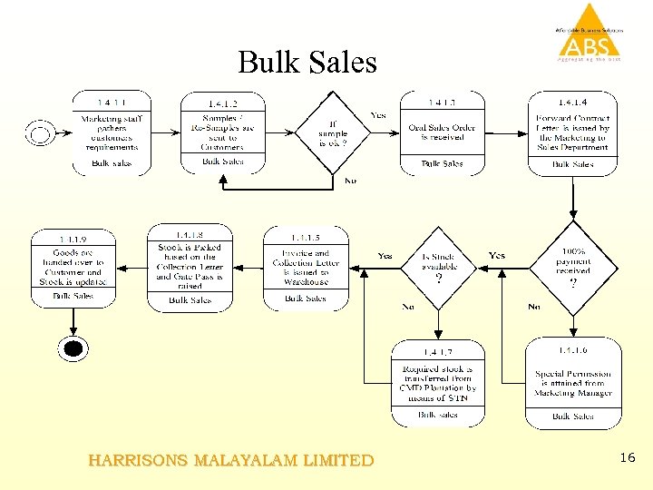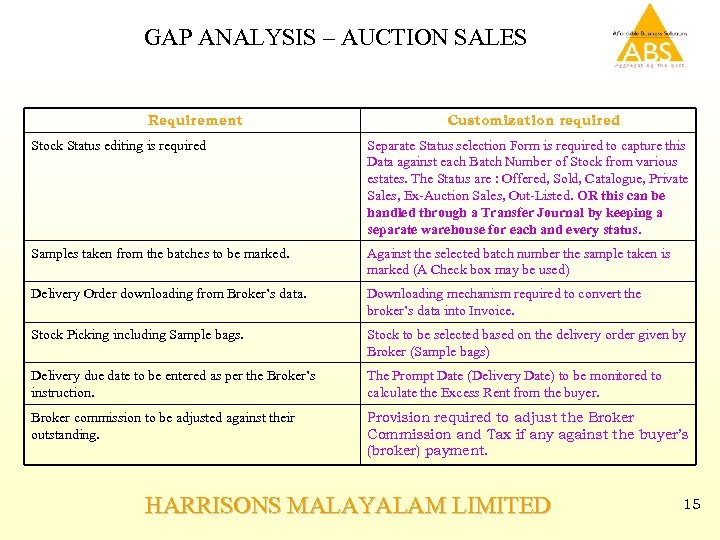 GAP ANALYSIS – AUCTION SALES Requirement Customization required Stock Status editing is required Separate Status selection Form is required to capture this Data against each Batch Number of Stock from various estates. The Status are : Offered, Sold, Catalogue, Private Sales, Ex-Auction Sales, Out-Listed. OR this can be handled through a Transfer Journal by keeping a separate warehouse for each and every status. Samples taken from the batches to be marked. Against the selected batch number the sample taken is marked (A Check box may be used) Delivery Order downloading from Broker’s data. Downloading mechanism required to convert the broker’s data into Invoice. Stock Picking including Sample bags. Stock to be selected based on the delivery order given by Broker (Sample bags) Delivery due date to be entered as per the Broker’s instruction. The Prompt Date (Delivery Date) to be monitored to calculate the Excess Rent from the buyer. Broker commission to be adjusted against their outstanding. Provision required to adjust the Broker Commission and Tax if any against the buyer’s (broker) payment. HARRISONS MALAYALAM LIMITED 15