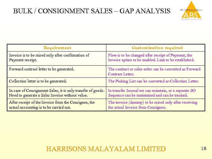 BULK / CONSIGNMENT SALES – GAP ANALYSIS Requirement Customization required Invoice is to be raised only after confirmation of Payment receipt. Flow is to be changed after receipt of Payment, the Invoice option to be enabled. Link to be established. Forward contract letter to be generated. The contract or sales order can be converted as Forward Contract Letter. Collection letter is to be generated. The Picking List can be converted as Collection Letter. In case of Consignment Sales, it is only transfer of goods. In transfer Journal we can maintain, or a separate SO Need to generate a Sales Invoice without value. Sequence can be maintained and can be tracked. After receipt of the Invoice from the Consignee, the actual accounting is to be carried out. The invoice (dummy) to be raised only after receiving the actual Invoice from Consignee. HARRISONS MALAYALAM LIMITED 18