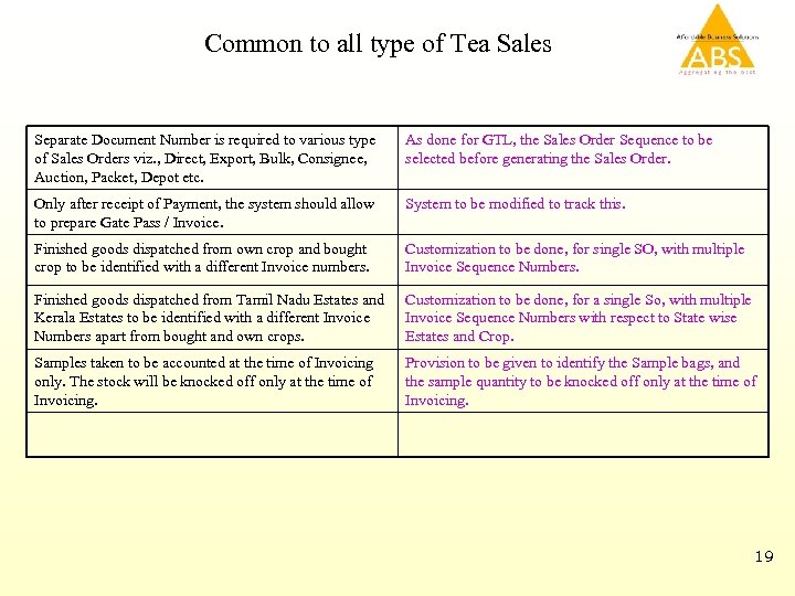 Common to all type of Tea Sales Separate Document Number is required to various type of Sales Orders viz. , Direct, Export, Bulk, Consignee, Auction, Packet, Depot etc. As done for GTL, the Sales Order Sequence to be selected before generating the Sales Order. Only after receipt of Payment, the system should allow to prepare Gate Pass / Invoice. System to be modified to track this. Finished goods dispatched from own crop and bought crop to be identified with a different Invoice numbers. Customization to be done, for single SO, with multiple Invoice Sequence Numbers. Finished goods dispatched from Tamil Nadu Estates and Kerala Estates to be identified with a different Invoice Numbers apart from bought and own crops. Customization to be done, for a single So, with multiple Invoice Sequence Numbers with respect to State wise Estates and Crop. Samples taken to be accounted at the time of Invoicing only. The stock will be knocked off only at the time of Invoicing. Provision to be given to identify the Sample bags, and the sample quantity to be knocked off only at the time of Invoicing. 19
