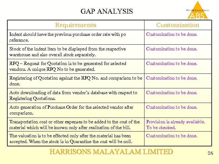 GAP ANALYSIS Requirements Customization Indent should have the previous purchase order rate with po reference. Customization to be done. Stock of the indent item to be displayed from the respective warehouse and also overall stock separately. Customization to be done. RFQ – Request for Quotation is to be generated for selected vendors. A unique RFQ No to be generated. Customization to be done. Registering of Quotation against the RFQ No. and comparison to be Customization to be done. Auto downloading of data from vendor’s database with respect to Registering Quotations. Customization to be done. Auto generation of Purchase Order for the selected vendor after comparison. Customization to be done. Transportation cost or other expenses to be added to the cost of the material which will be known only after realization of the bill. Provision is already available. To be checked. The valuation is to be effected only after the material has been accepted. When the stock is in Quarantine the cost will be null. Customization to be done. HARRISONS MALAYALAM LIMITED 26