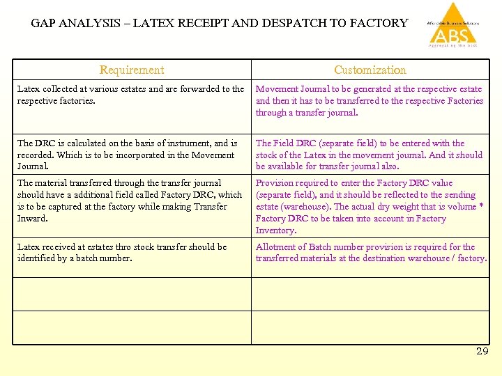 GAP ANALYSIS – LATEX RECEIPT AND DESPATCH TO FACTORY Requirement Customization Latex collected at various estates and are forwarded to the Movement Journal to be generated at the respective estate respective factories. and then it has to be transferred to the respective Factories through a transfer journal. The DRC is calculated on the basis of instrument, and is recorded. Which is to be incorporated in the Movement Journal. The Field DRC (separate field) to be entered with the stock of the Latex in the movement journal. And it should be available for transfer journal also. The material transferred through the transfer journal should have a additional field called Factory DRC, which is to be captured at the factory while making Transfer Inward. Provision required to enter the Factory DRC value (separate field), and it should be reflected to the sending estate (warehouse). The actual dry weight that is volume * Factory DRC to be taken into account in Factory Inventory. Latex received at estates thro stock transfer should be identified by a batch number. Allotment of Batch number provision is required for the transferred materials at the destination warehouse / factory. 29