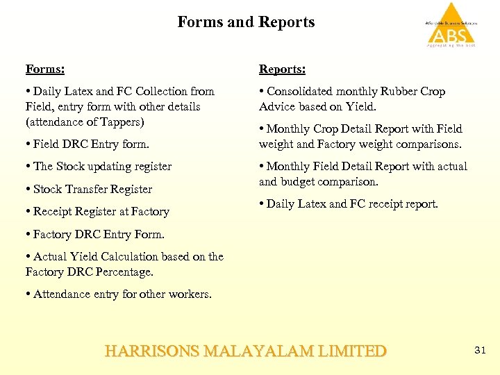 Forms and Reports Forms: Reports: • Daily Latex and FC Collection from Field, entry form with other details (attendance of Tappers) • Consolidated monthly Rubber Crop Advice based on Yield. • Field DRC Entry form. • The Stock updating register • Stock Transfer Register • Receipt Register at Factory • Monthly Crop Detail Report with Field weight and Factory weight comparisons. • Monthly Field Detail Report with actual and budget comparison. • Daily Latex and FC receipt report. • Factory DRC Entry Form. • Actual Yield Calculation based on the Factory DRC Percentage. • Attendance entry for other workers. HARRISONS MALAYALAM LIMITED 31