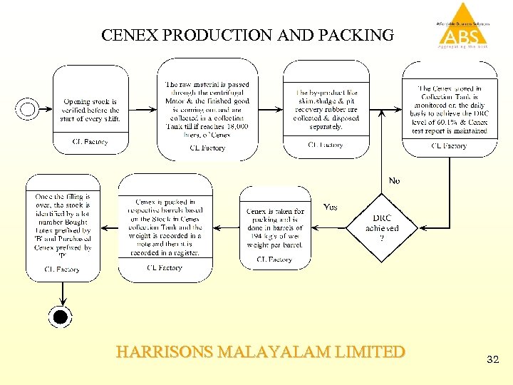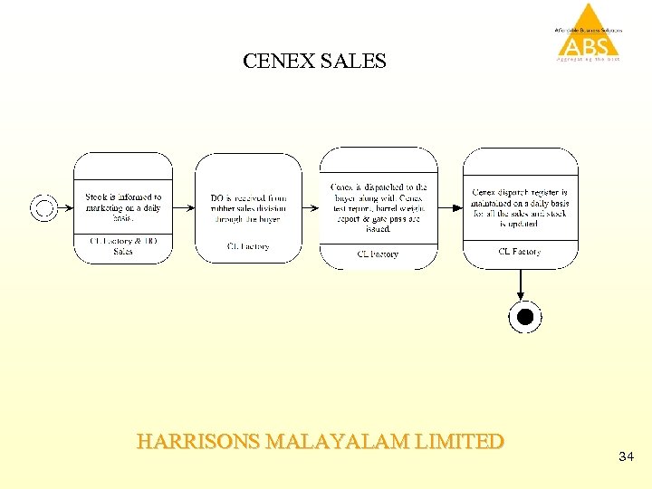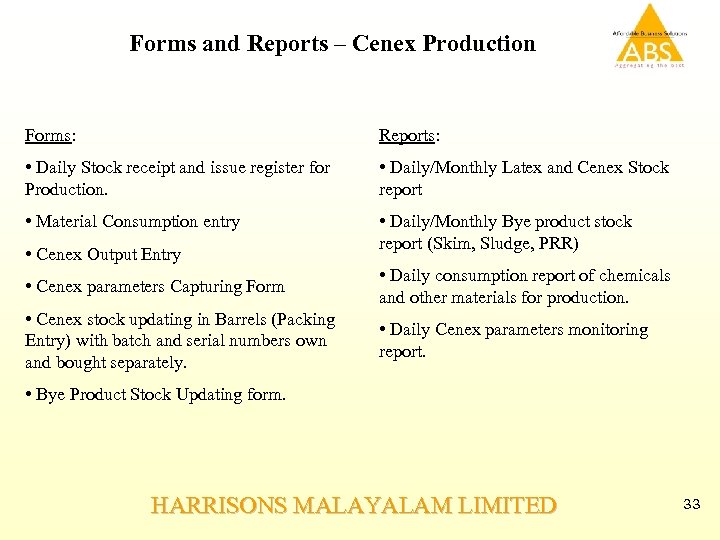 Forms and Reports – Cenex Production Forms: Reports: • Daily Stock receipt and issue register for Production. • Daily/Monthly Latex and Cenex Stock report • Material Consumption entry • Daily/Monthly Bye product stock report (Skim, Sludge, PRR) • Cenex Output Entry • Cenex parameters Capturing Form • Daily consumption report of chemicals and other materials for production. • Cenex stock updating in Barrels (Packing Entry) with batch and serial numbers own and bought separately. • Daily Cenex parameters monitoring report. • Bye Product Stock Updating form. HARRISONS MALAYALAM LIMITED 33