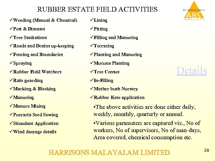 RUBBER ESTATE FIELD ACTIVITIES üWeeding (Manual & Chemical) üLining üPest & Diseases üPitting üTree Sanitations üFilling and Manuring üRoads and Drains up-keeping üTerracing üFencing and Boundaries üPlanting and Manuring üSpraying üMucuna Planting üRubber Field Watchers üTree Census üRain guarding üIn-Filling üMarking & Blocking üMother bush Nursery üManuring üRubber Kote application üManure Mixing üPueraria Seed Sowing üStimulant Application üWind damage details Details • The above activities are done either daily, weekly, monthly, quarterly or annual. • Various parameters are captured viz. , No of workers, No of supervisors, No of man-days, Area covered, chemical consumption etc. HARRISONS MALAYALAM LIMITED 38