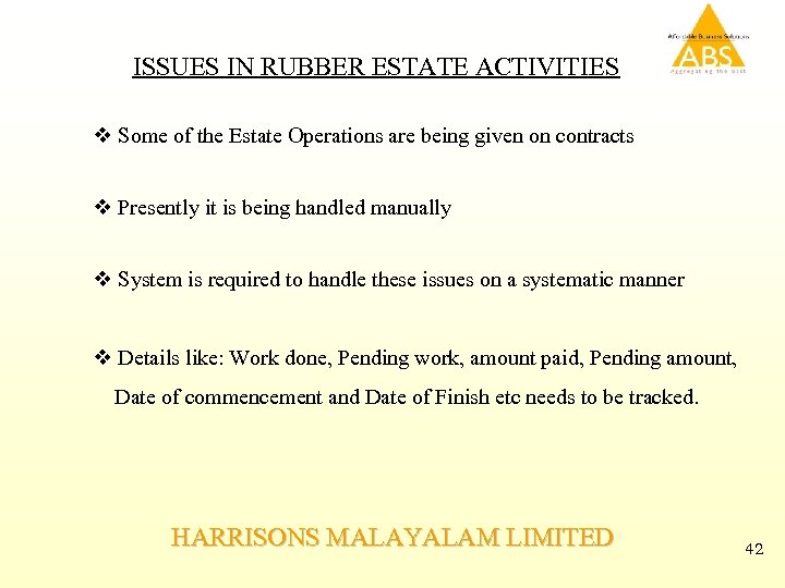 ISSUES IN RUBBER ESTATE ACTIVITIES v Some of the Estate Operations are being given on contracts v Presently it is being handled manually v System is required to handle these issues on a systematic manner v Details like: Work done, Pending work, amount paid, Pending amount, Date of commencement and Date of Finish etc needs to be tracked. HARRISONS MALAYALAM LIMITED 42