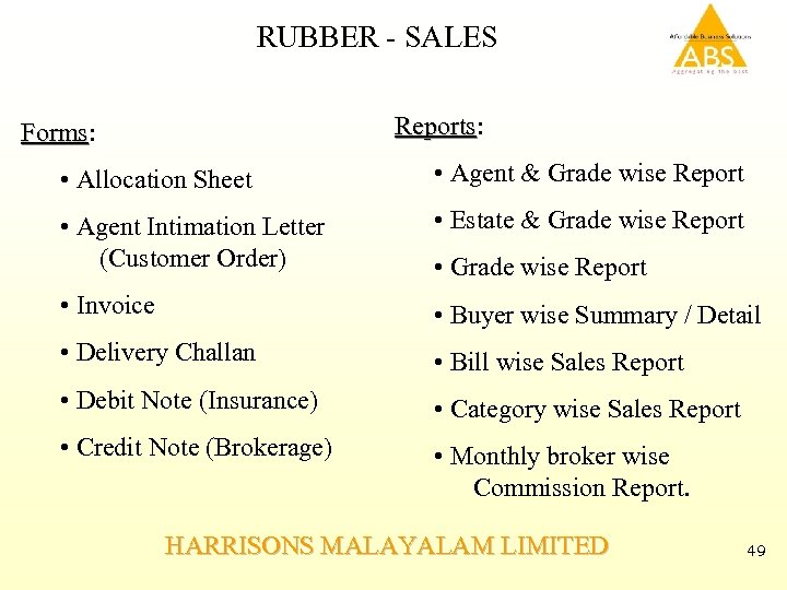 RUBBER - SALES Reports: Reports Forms: Forms • Allocation Sheet • Agent & Grade wise Report • Agent Intimation Letter (Customer Order) • Estate & Grade wise Report • Invoice • Buyer wise Summary / Detail • Delivery Challan • Bill wise Sales Report • Debit Note (Insurance) • Category wise Sales Report • Credit Note (Brokerage) • Monthly broker wise Commission Report. • Grade wise Report HARRISONS MALAYALAM LIMITED 49