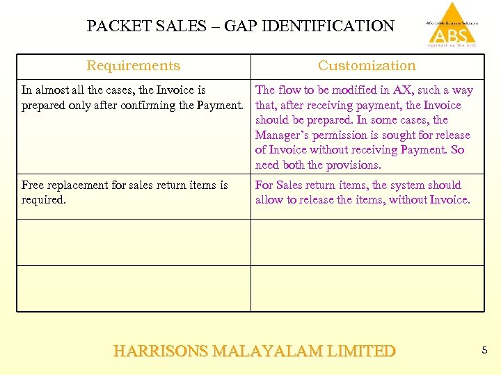 PACKET SALES – GAP IDENTIFICATION Requirements Customization In almost all the cases, the Invoice is The flow to be modified in AX, such a way prepared only after confirming the Payment. that, after receiving payment, the Invoice should be prepared. In some cases, the Manager’s permission is sought for release of Invoice without receiving Payment. So need both the provisions. Free replacement for sales return items is required. For Sales return items, the system should allow to release the items, without Invoice. HARRISONS MALAYALAM LIMITED 5