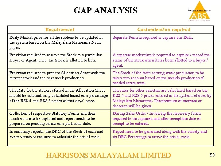 GAP ANALYSIS Requirement Customization required Daily Market price for all the rubbers to be updated in the system based on the Malayalam Manorama News paper. Separate Form is required to capture this Data. Provision required to reserve the Stock to a particular Buyer or Agent, once the Stock is allotted to him. A separate mechanism is required to capture / record the status of the stock when it has been allotted to a buyer / agent. Provision required to prepare Allocation Sheet with the current stock and the next week production. The Stock of the forth coming week production to be taken into account based on the weekly production if needed estate wise. The Rate for the stocks referred in the Allocation Sheet The rates for other varieties are calculated based on the should be automatically calculated based on a percentage RSS 4 and RSS 5 prices entered in the system referred by of the RSS 4 and RSS 5 prices of that days’ price. Malayalam Manorama. The premium of increase or decrease will be given. Collection of respective Statutory Forms and their numbers are to be captured and report needs to be prepared on pending forms on a particular date. During Sales Order / Invoicing the necessary forms required to be captured and after receipt the date of receipt to be entered. In summary reports, the DRC of the Stock of each and every variety is required to calculate the actual yield. Report need to be generated along with the variety and its DRC Percentage to arrive the actual yield. HARRISONS MALAYALAM LIMITED 50