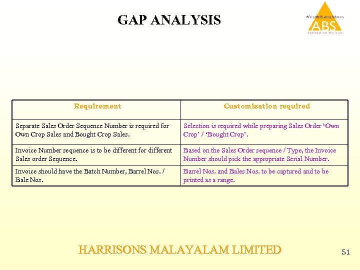 GAP ANALYSIS Requirement Customization required Separate Sales Order Sequence Number is required for Own Crop Sales and Bought Crop Sales. Selection is required while preparing Sales Order ‘Own Crop’ / ‘Bought Crop’. Invoice Number sequence is to be different for different Sales order Sequence. Based on the Sales Order sequence / Type, the Invoice Number should pick the appropriate Serial Number. Invoice should have the Batch Number, Barrel Nos. / Bale Nos. Barrel Nos. and Bales Nos. to be captured and to be printed as a range. HARRISONS MALAYALAM LIMITED 51