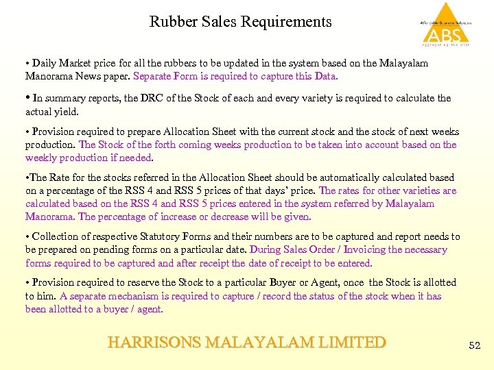 Rubber Sales Requirements • Daily Market price for all the rubbers to be updated in the system based on the Malayalam Manorama News paper. Separate Form is required to capture this Data. • In summary reports, the DRC of the Stock of each and every variety is required to calculate the actual yield. • Provision required to prepare Allocation Sheet with the current stock and the stock of next weeks production. The Stock of the forth coming weeks production to be taken into account based on the weekly production if needed. • The Rate for the stocks referred in the Allocation Sheet should be automatically calculated based on a percentage of the RSS 4 and RSS 5 prices of that days’ price. The rates for other varieties are calculated based on the RSS 4 and RSS 5 prices entered in the system referred by Malayalam Manorama. The percentage of increase or decrease will be given. • Collection of respective Statutory Forms and their numbers are to be captured and report needs to be prepared on pending forms on a particular date. During Sales Order / Invoicing the necessary forms required to be captured and after receipt the date of receipt to be entered. • Provision required to reserve the Stock to a particular Buyer or Agent, once the Stock is allotted to him. A separate mechanism is required to capture / record the status of the stock when it has been allotted to a buyer / agent. HARRISONS MALAYALAM LIMITED 52
