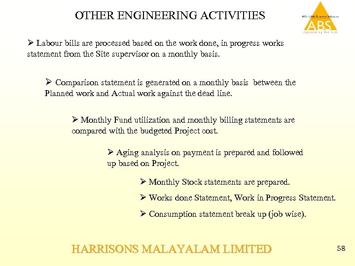 OTHER ENGINEERING ACTIVITIES Ø Labour bills are processed based on the work done, in progress works statement from the Site supervisor on a monthly basis. Ø Comparison statement is generated on a monthly basis between the Planned work and Actual work against the dead line. Ø Monthly Fund utilization and monthly billing statements are compared with the budgeted Project cost. Ø Aging analysis on payment is prepared and followed up based on Project. Ø Monthly Stock statements are prepared. Ø Works done Statement, Work in Progress Statement. Ø Consumption statement break up (job wise). HARRISONS MALAYALAM LIMITED 58