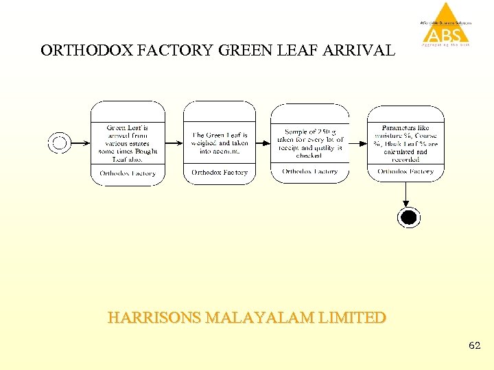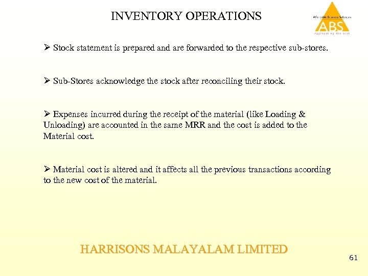 INVENTORY OPERATIONS Ø Stock statement is prepared and are forwarded to the respective sub-stores. Ø Sub-Stores acknowledge the stock after reconciling their stock. Ø Expenses incurred during the receipt of the material (like Loading & Unloading) are accounted in the same MRR and the cost is added to the Material cost. Ø Material cost is altered and it affects all the previous transactions according to the new cost of the material. HARRISONS MALAYALAM LIMITED 61