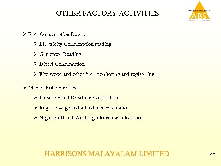 OTHER FACTORY ACTIVITIES Ø Fuel Consumption Details: Ø Electricity Consumption reading. Ø Generator Reading Ø Diesel Consumption Ø Fire wood and other fuel monitoring and registering Ø Muster Roll activities Ø Incentive and Overtime Calculation Ø Regular wage and attendance calculation Ø Night Shift and Washing allowance calculation HARRISONS MALAYALAM LIMITED 65
