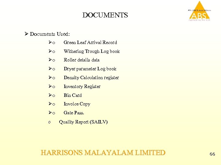 DOCUMENTS Ø Documents Used: Øo Green Leaf Arrival Record Øo Withering Trough Log book Øo Roller details data Øo Dryer parameter Log book Øo Density Calculation register Øo Inventory Register Øo Bin Card Øo Invoice Copy Øo Gate Pass. o Quality Report (SAILV) HARRISONS MALAYALAM LIMITED 66
