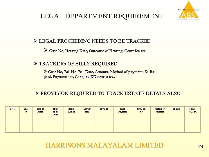 LEGAL DEPARTMENT REQUIREMENT Ø LEGAL PROCEEDING NEEDS TO BE TRACKED Ø Case No, Hearing Date, Outcome of Hearing, Court fee etc. Ø TRACKING OF BILLS REQUIRED Ø Case No, Bill Date, Amount, Method of payment, So far paid, Payment for, Cheque / DD details etc. Ø PROVISION REQUIRED TO TRACK ESTATE DETALS ALSO S. No. Case # Date of Filing Name of the Party Estate Details Lawyer detail Payment Dt of Payment for Method of Payment Bill No Name of Court HARRISONS MALAYALAM LIMITED 74