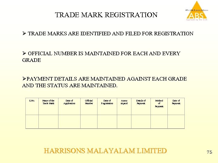 TRADE MARK REGISTRATION Ø TRADE MARKS ARE IDENTIFIED AND FILED FOR REGISTRATION Ø OFFICIAL NUMBER IS MAINTAINED FOR EACH AND EVERY GRADE ØPAYMENT DETAILS ARE MAINTAINED AGAINST EACH GRADE AND THE STATUS ARE MAINTAINED. S. No. Name of the Trade Mark Date of Application Official Number Date of Registration Amou nt paid Details of Payment Method of Payment Date of Payment HARRISONS MALAYALAM LIMITED 75