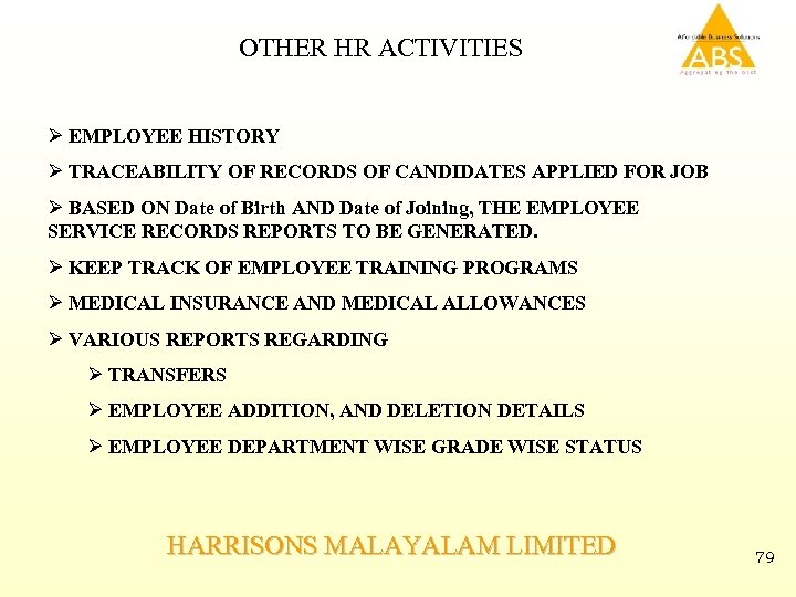 OTHER HR ACTIVITIES Ø EMPLOYEE HISTORY Ø TRACEABILITY OF RECORDS OF CANDIDATES APPLIED FOR JOB Ø BASED ON Date of Birth AND Date of Joining, THE EMPLOYEE SERVICE RECORDS REPORTS TO BE GENERATED. Ø KEEP TRACK OF EMPLOYEE TRAINING PROGRAMS Ø MEDICAL INSURANCE AND MEDICAL ALLOWANCES Ø VARIOUS REPORTS REGARDING Ø TRANSFERS Ø EMPLOYEE ADDITION, AND DELETION DETAILS Ø EMPLOYEE DEPARTMENT WISE GRADE WISE STATUS HARRISONS MALAYALAM LIMITED 79