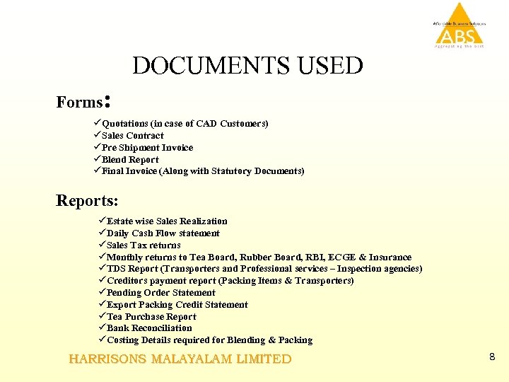 DOCUMENTS USED Forms: üQuotations (in case of CAD Customers) üSales Contract üPre Shipment Invoice üBlend Report üFinal Invoice (Along with Statutory Documents) Reports: üEstate wise Sales Realization üDaily Cash Flow statement üSales Tax returns üMonthly returns to Tea Board, Rubber Board, RBI, ECGE & Insurance üTDS Report (Transporters and Professional services – Inspection agencies) üCreditors payment report (Packing Items & Transporters) üPending Order Statement üExport Packing Credit Statement üTea Purchase Report üBank Reconciliation üCosting Details required for Blending & Packing HARRISONS MALAYALAM LIMITED 8