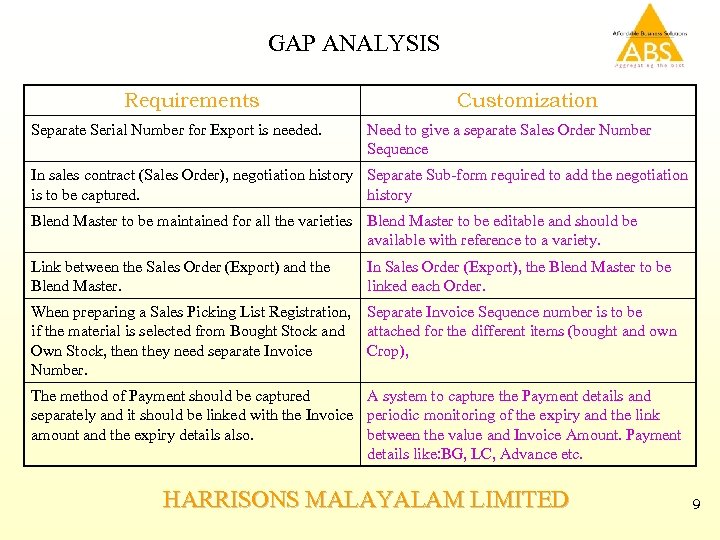 GAP ANALYSIS Requirements Separate Serial Number for Export is needed. Customization Need to give a separate Sales Order Number Sequence In sales contract (Sales Order), negotiation history Separate Sub-form required to add the negotiation is to be captured. history Blend Master to be maintained for all the varieties Blend Master to be editable and should be available with reference to a variety. Link between the Sales Order (Export) and the Blend Master. In Sales Order (Export), the Blend Master to be linked each Order. When preparing a Sales Picking List Registration, Separate Invoice Sequence number is to be if the material is selected from Bought Stock and attached for the different items (bought and own Own Stock, then they need separate Invoice Crop), Number. The method of Payment should be captured A system to capture the Payment details and separately and it should be linked with the Invoice periodic monitoring of the expiry and the link amount and the expiry details also. between the value and Invoice Amount. Payment details like: BG, LC, Advance etc. HARRISONS MALAYALAM LIMITED 9