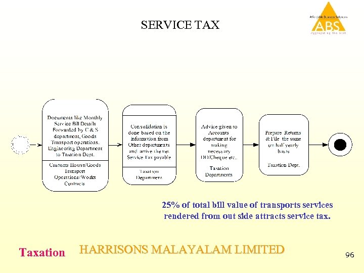 SERVICE TAX 25% of total bill value of transports services rendered from out side attracts service tax. Taxation HARRISONS MALAYALAM LIMITED 96
