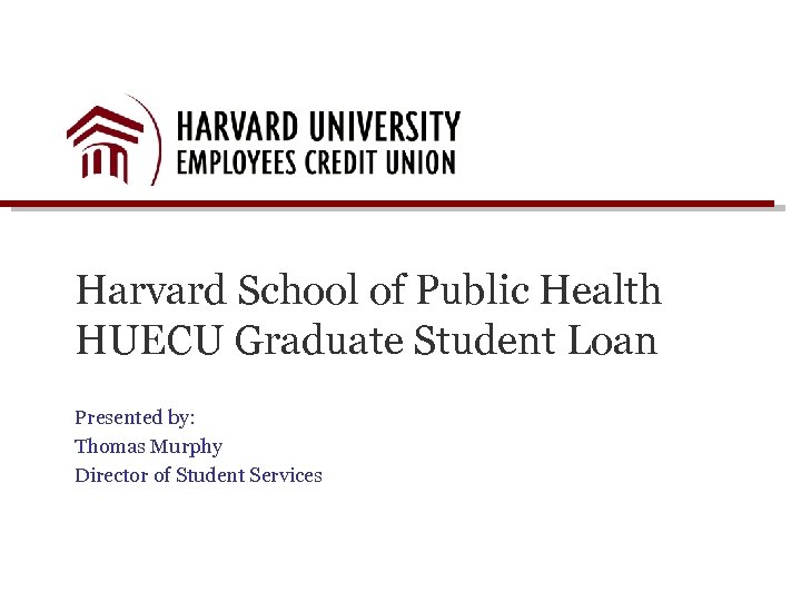 Harvard School of Public Health HUECU Graduate Student Loan Presented by: Thomas Murphy Director of Student Services