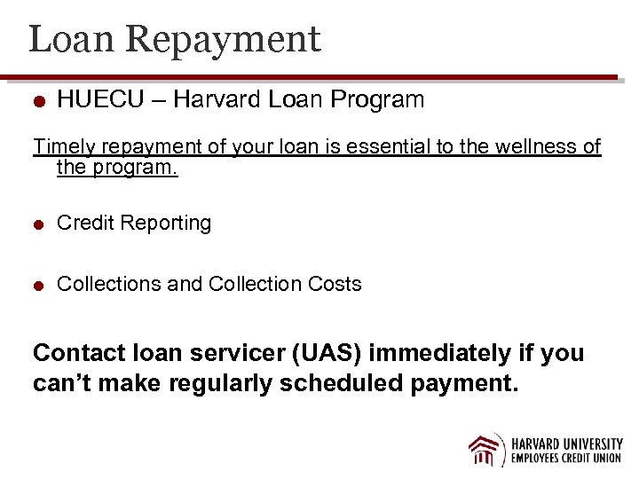 Loan Repayment HUECU – Harvard Loan Program Timely repayment of your loan is essential to the wellness of the program. Credit Reporting Collections and Collection Costs Contact loan servicer (UAS) immediately if you can’t make regularly scheduled payment.