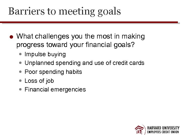 Barriers to meeting goals What challenges you the most in making progress toward your financial goals? Impulse buying Unplanned spending and use of credit cards Poor spending habits Loss of job Financial emergencies
