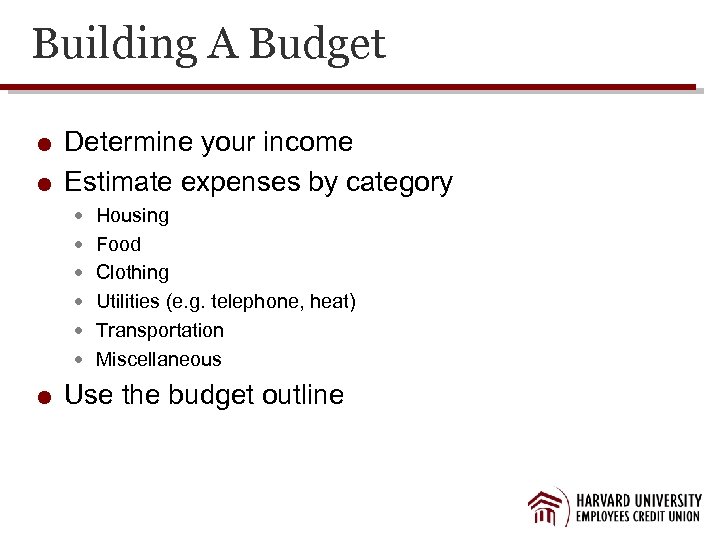 Building A Budget Determine your income Estimate expenses by category Housing Food Clothing Utilities (e. g. telephone, heat) Transportation Miscellaneous Use the budget outline