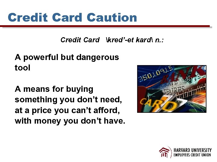 Credit Card Caution Credit Card kred’-et kard n. : A powerful but dangerous tool A means for buying something you don’t need, at a price you can’t afford, with money you don’t have.