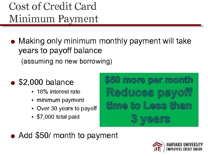 Cost of Credit Card Minimum Payment Making only minimum monthly payment will take years to payoff balance (assuming no new borrowing) $2, 000 balance • 18% interest rate • minimum payment • Over 30 years to payoff $50 more per month Reduces payoff time to Less than • $7, 000 total paid Add $50/ month to payment 3 years