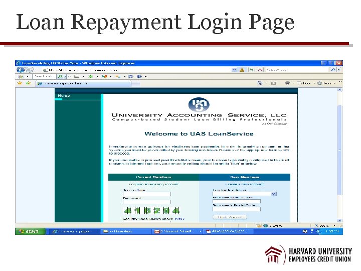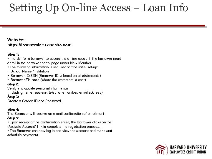 Harvard University Credit Union Loan Repayment Summary Repayment begins within 6 months Make payments in U. S. $ Set-up on-line account access Contact Information 800 -723 -2210 Or (262) 780 -2000 (for calls outside the U. S. ) Website: https: //loanservice. uasecho. com e-mail: uasloanservice@ncogroup. com